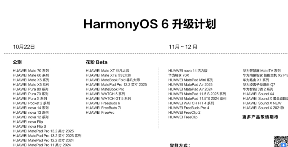 据了解,10月22日起,鸿蒙6面向首批90多款机型陆续开放升级。首批公测机型包括Mate 70、Mate 60、Pura 80 系列、Mate x6 系列等,11月-12月则开放至nova 14 活力版、MatePad系列等。此外,华为预告称,面向企业用户打造的鸿蒙电脑企业版OS也即将发布。