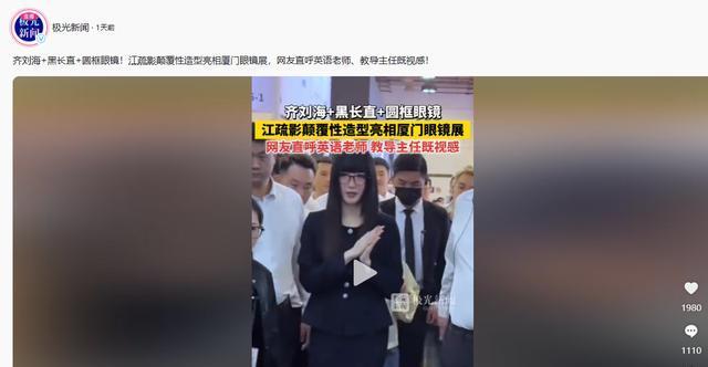 极光新闻《齐刘海+黑长直+圆框眼镜!江疏影颠覆性造型亮相厦门眼镜展,网友直呼英语老师、教导主任既视感!》