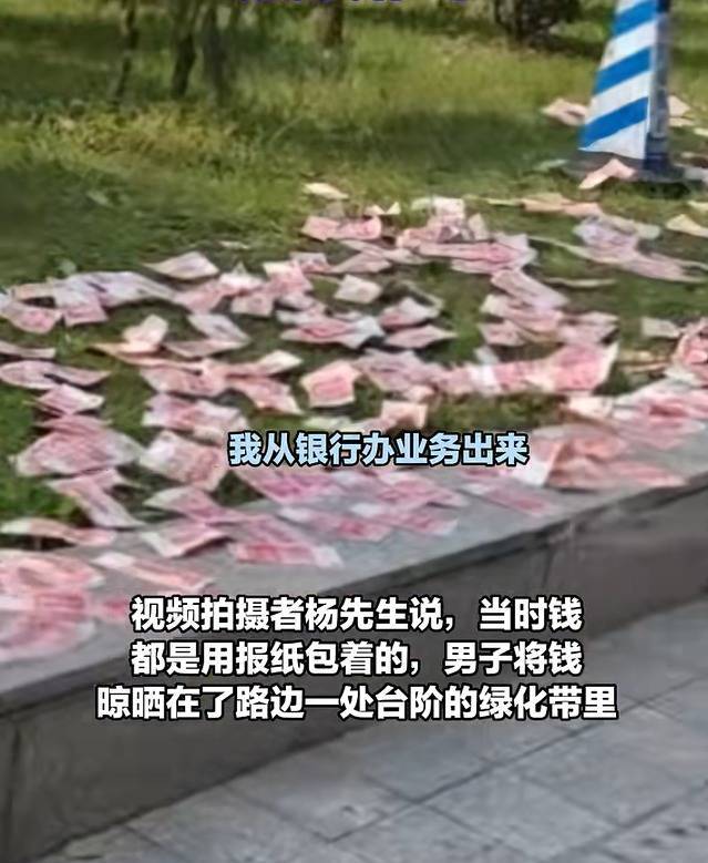 视频拍摄者杨先生说:“当时那男子只有一个人在,那一堆钱估计有个10万元左右。”杨先生称,当时钱都是用报纸包着的,男子将钱晾晒在了路边一处台阶的绿化带里,晒现金的男子说钱被打湿了,所以要晒一下。