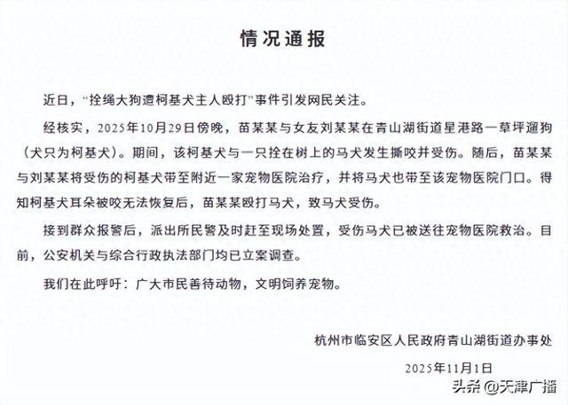 1日,杭州临安通报“拴绳大狗遭柯基犬主人殴打”事件。经核实,2025年10月29日傍晚,苗某某与女友刘某某在青山湖街道星港路一草坪遛狗(犬只为柯基犬)。期间,该柯基犬与一只拴在树上的马犬发生撕咬并受伤。随后,苗某某与刘某某将受伤的柯基犬带至附近一家宠物医院治疗,并将马犬也带至该宠物医院门口。得知柯基犬耳朵被咬无法恢复后,苗某某殴打马犬,致马犬受伤。接到群众报警后,派出所民警及时赶至现场处置,受伤马犬已被送往宠物医院救治。目前,公安机关与综合行政执法部门均已立案调查。