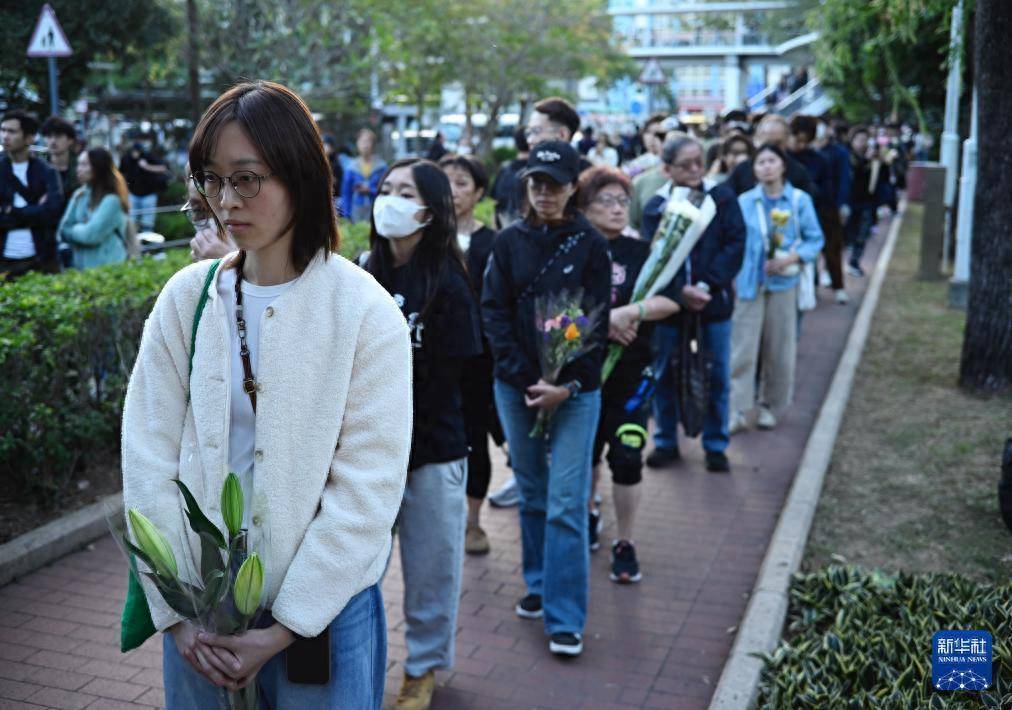 11月29日,在香港大埔宏福苑附近公园,人们排起长队等待献花。新华社发(王申摄)