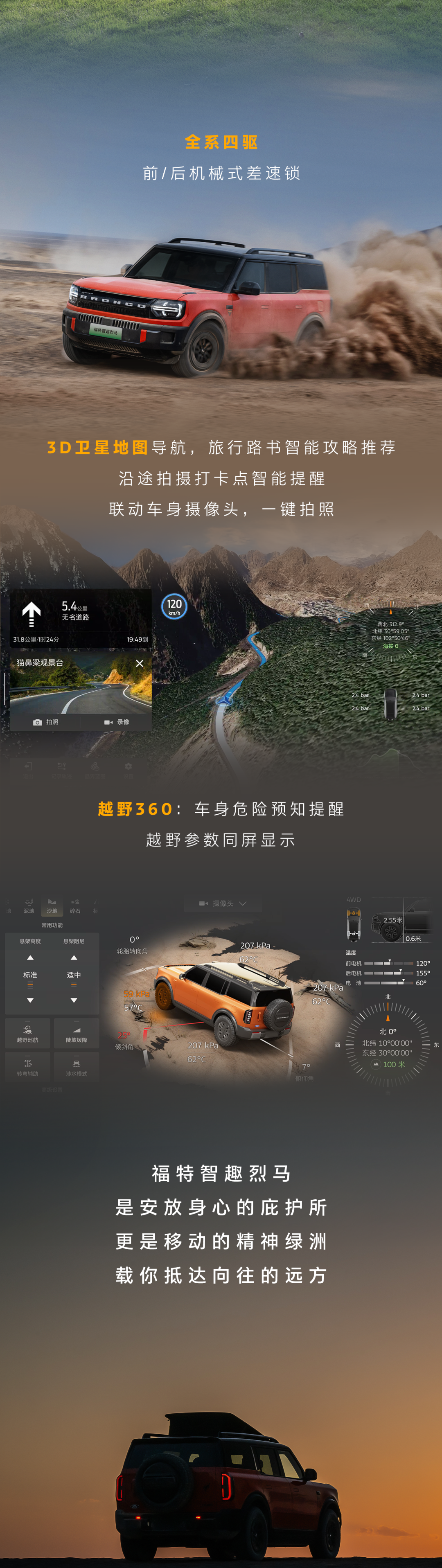 该车长度超 5 米,轴距近 3 米,配备前后两把机械式差速锁,提供增程、纯电两种动力,支持 6kW 对外放电。